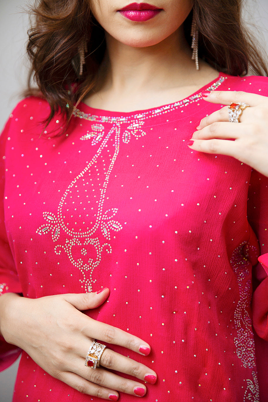 Fabric: The shirt is usually crafted from Krinkle Shaffun, the trousers from Kattan Silk, and the dupatta from Krinkle Shaffun .