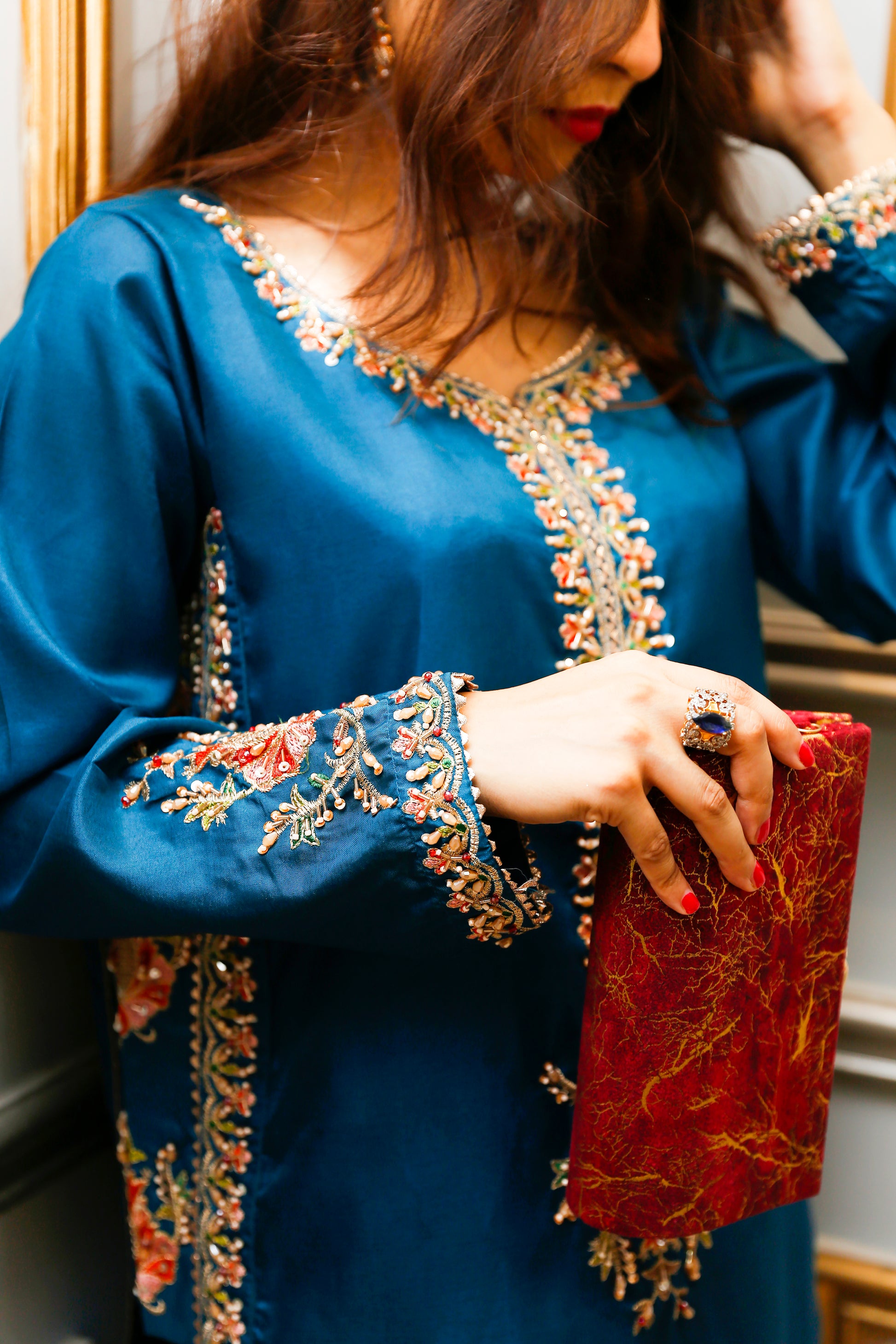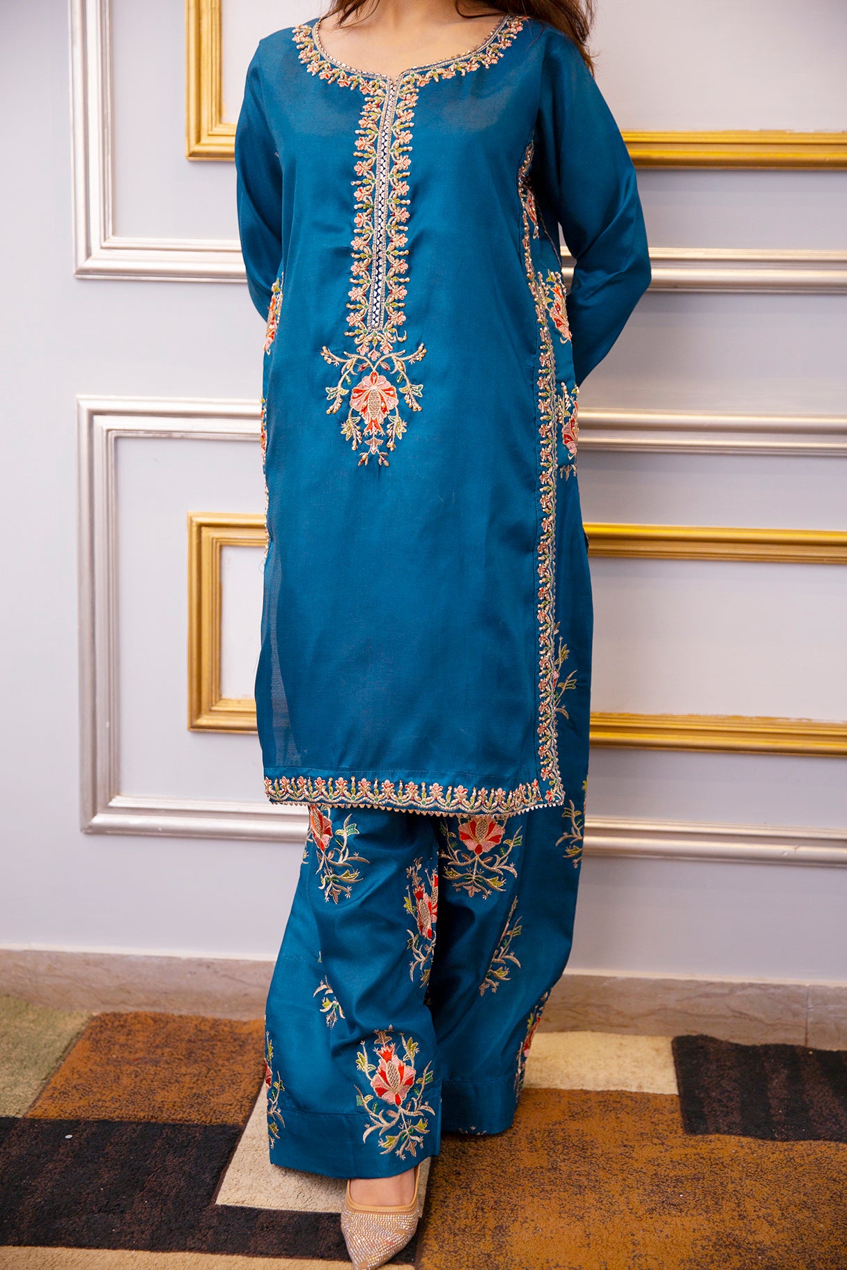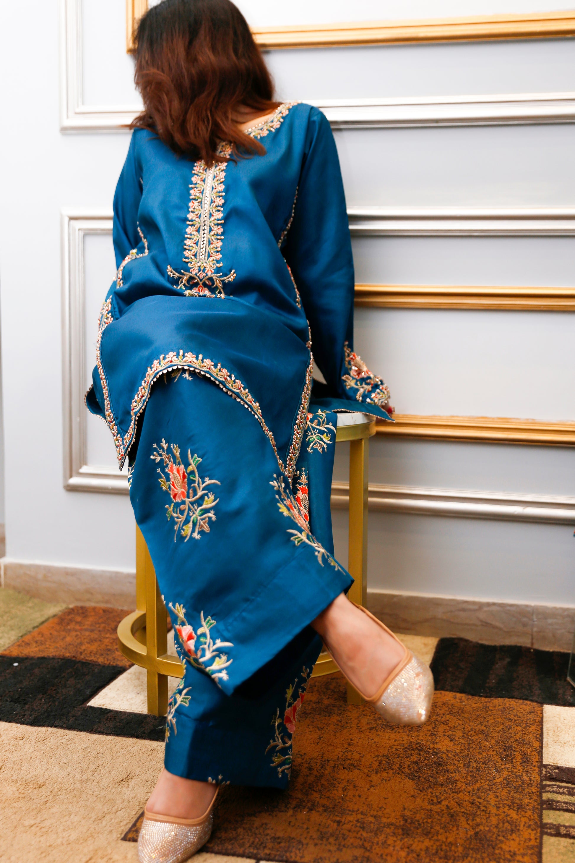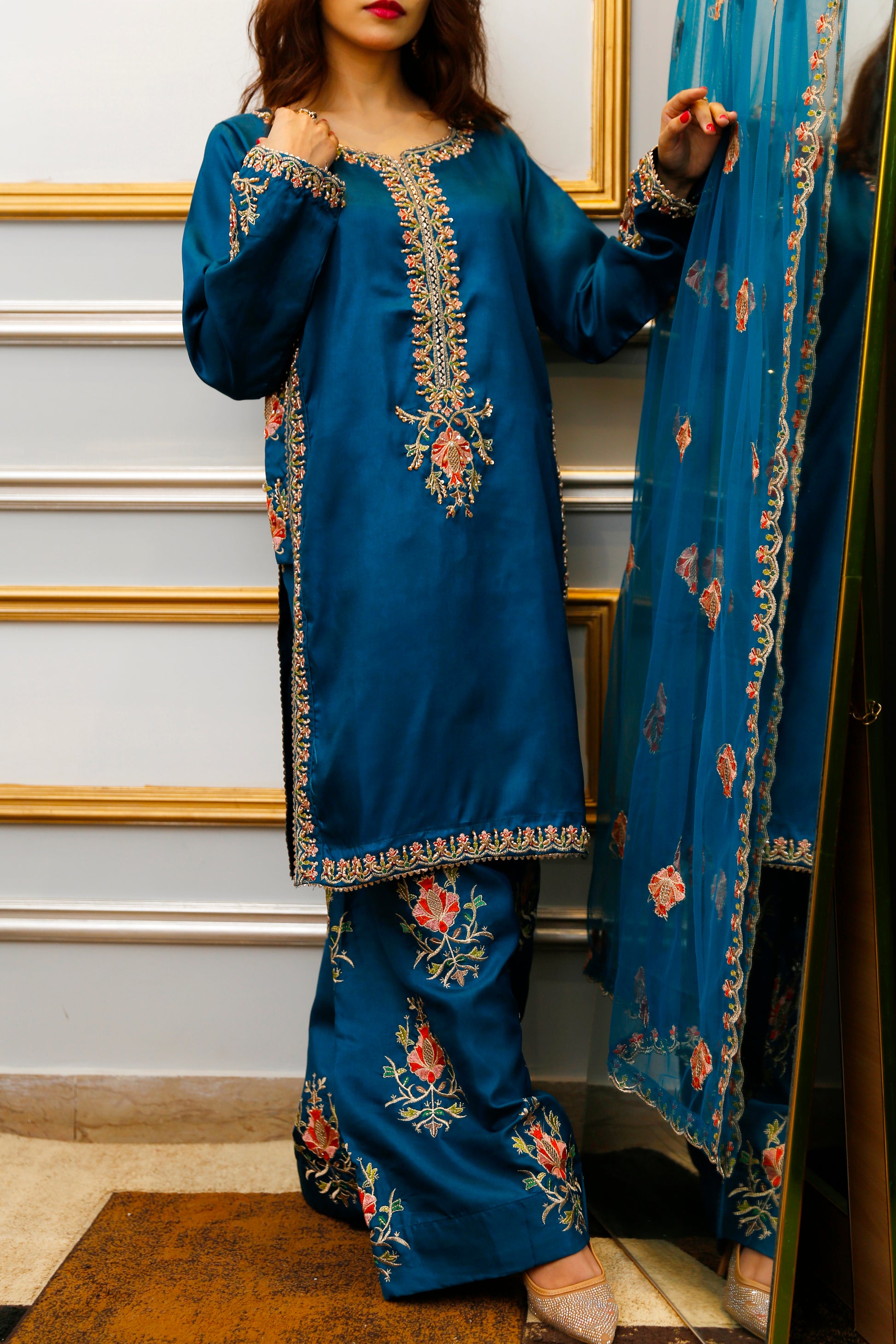 - Type: This is a ready-to-wear, three-piece stitched set in short shirt with Farshi shalwar.