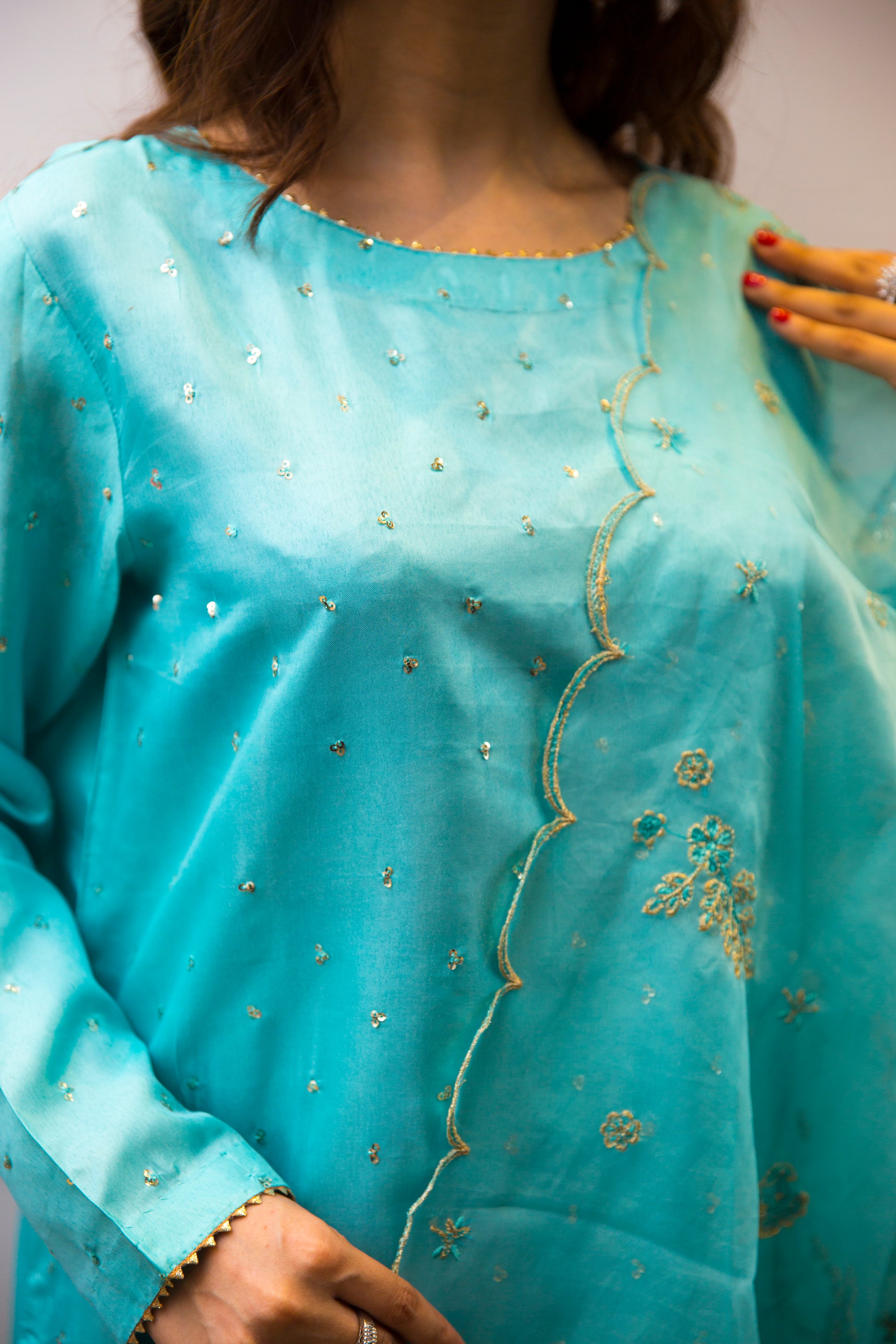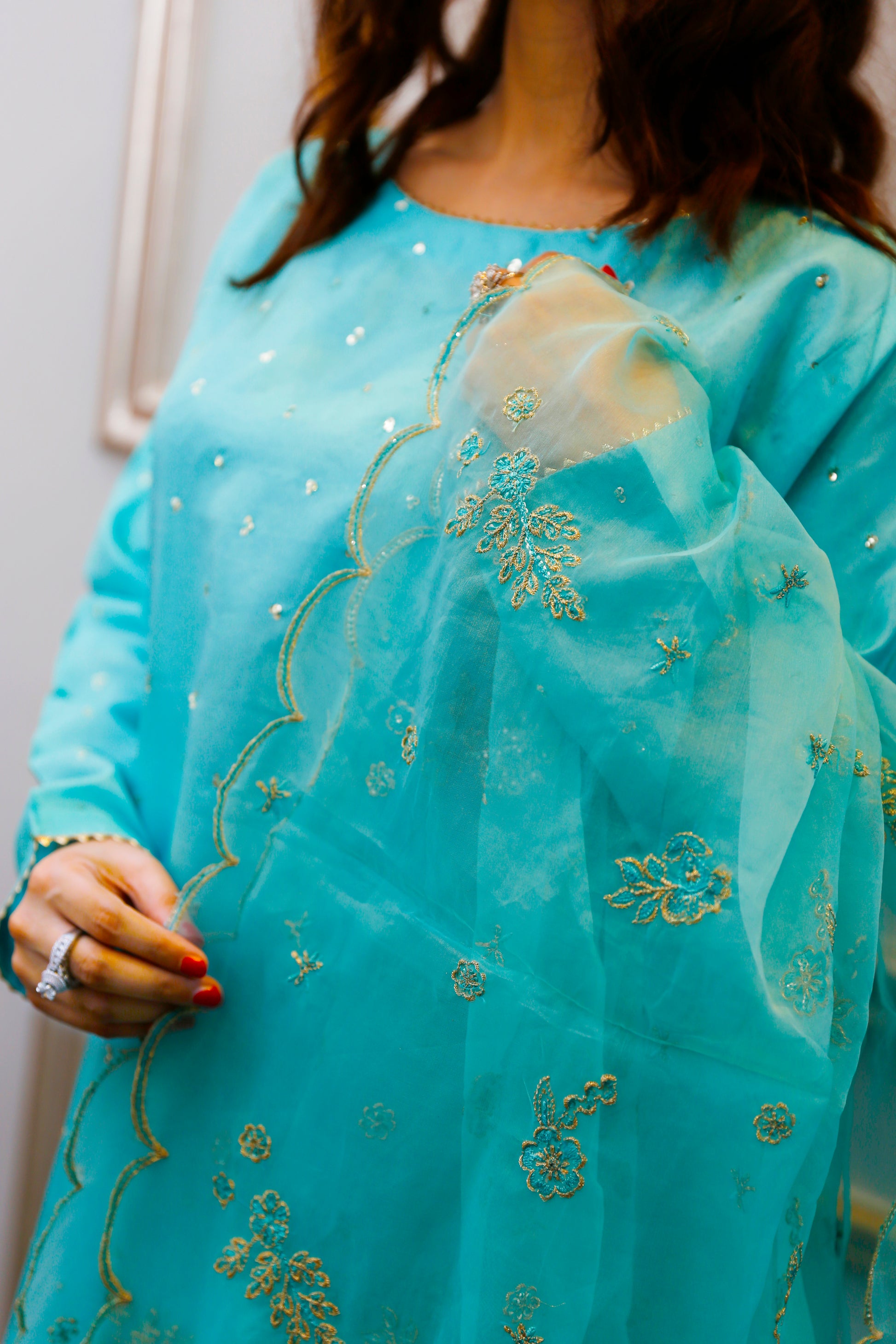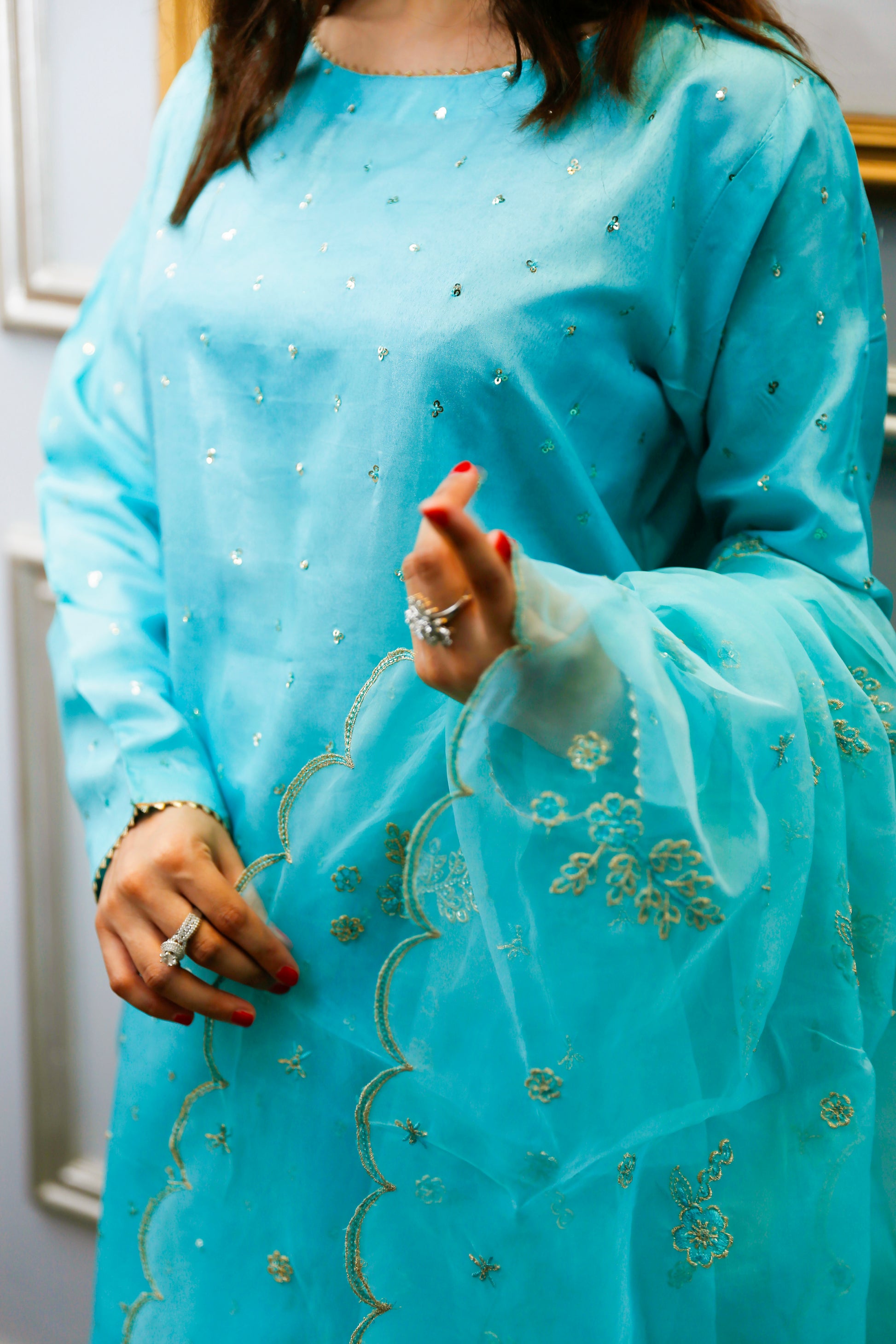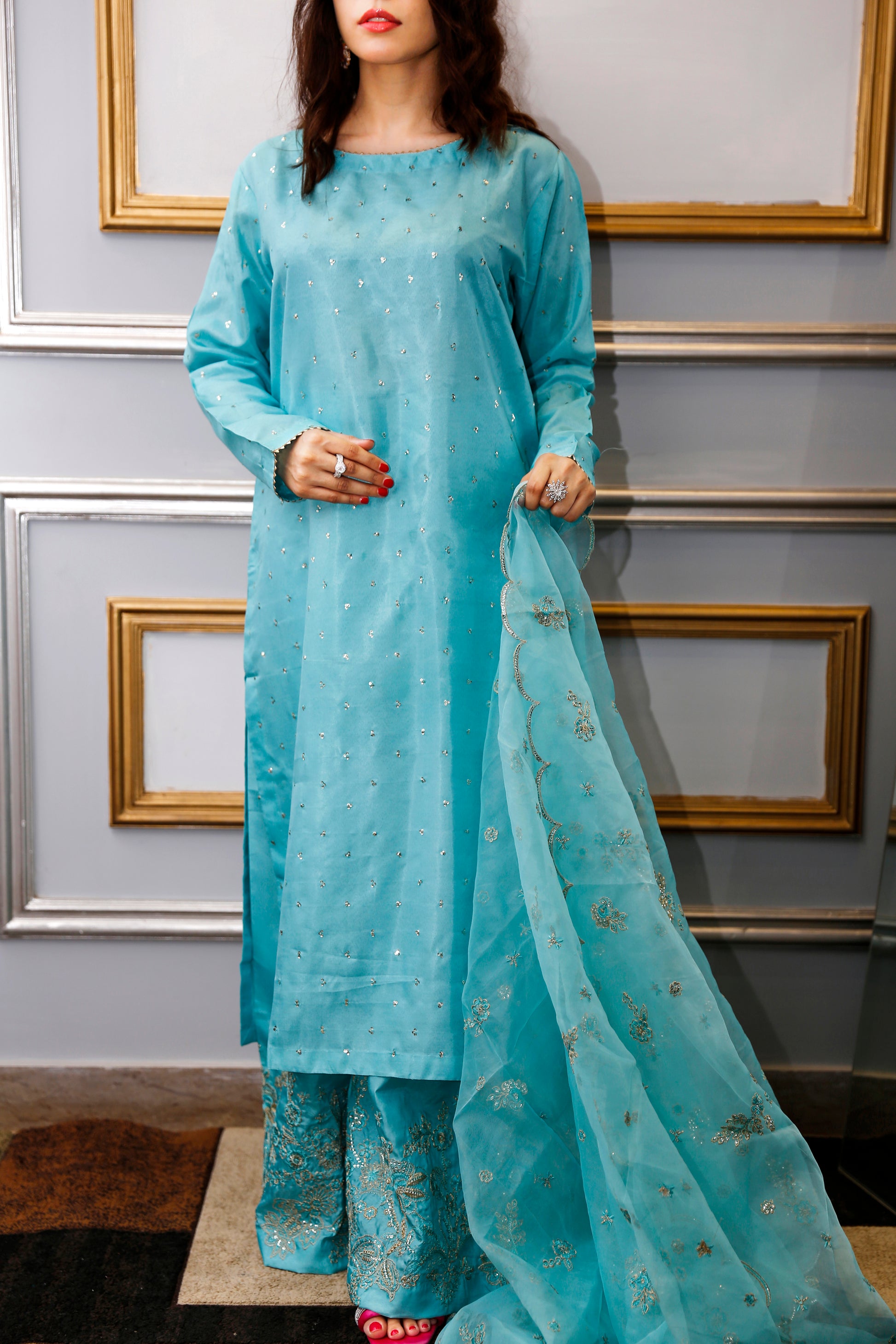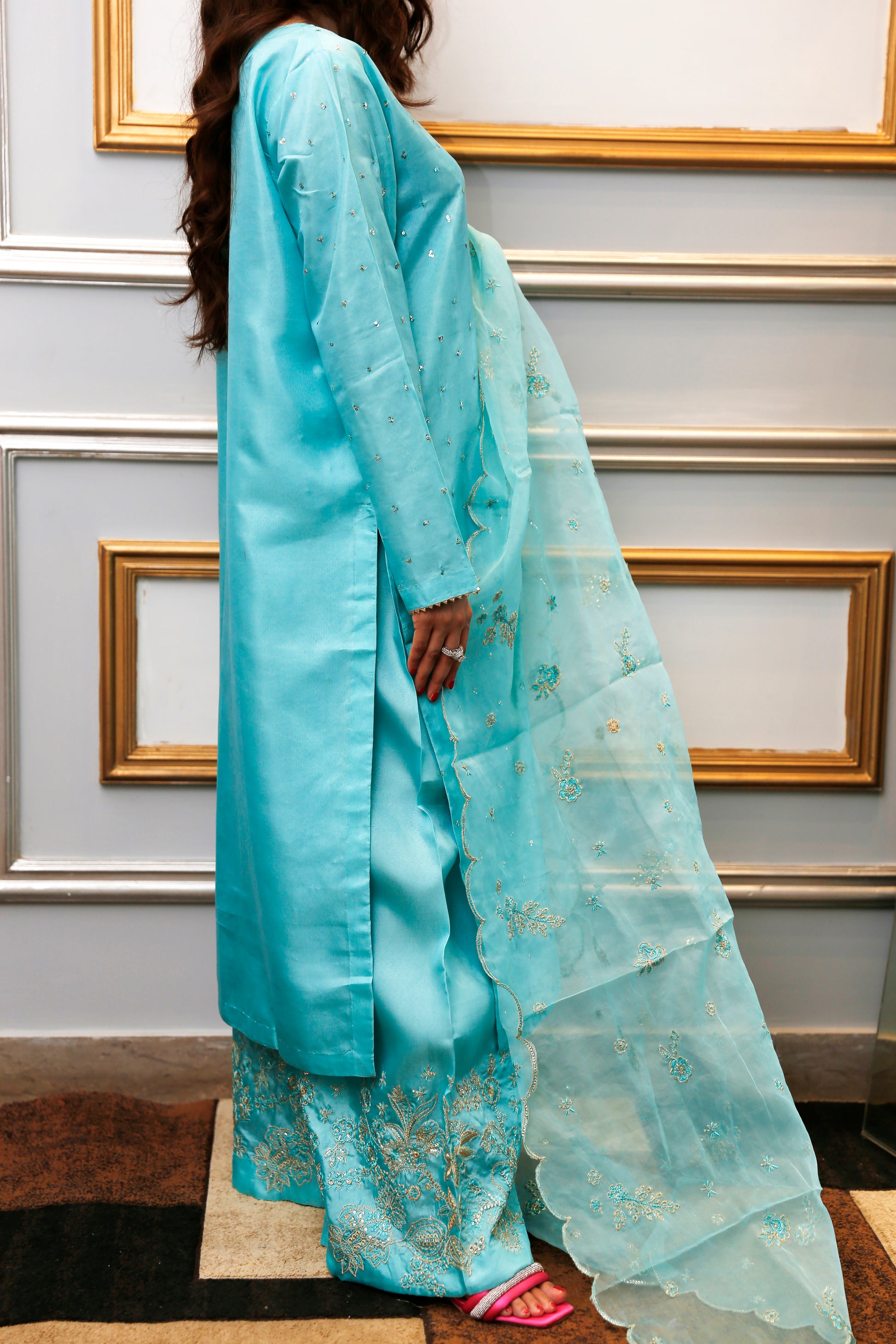 - Fabric: The outfit is a bright, eye-catching sky blue, made from a fabric like raw silk, viscose chanderi, or similar material, often chosen for its elegant drape and texture.
