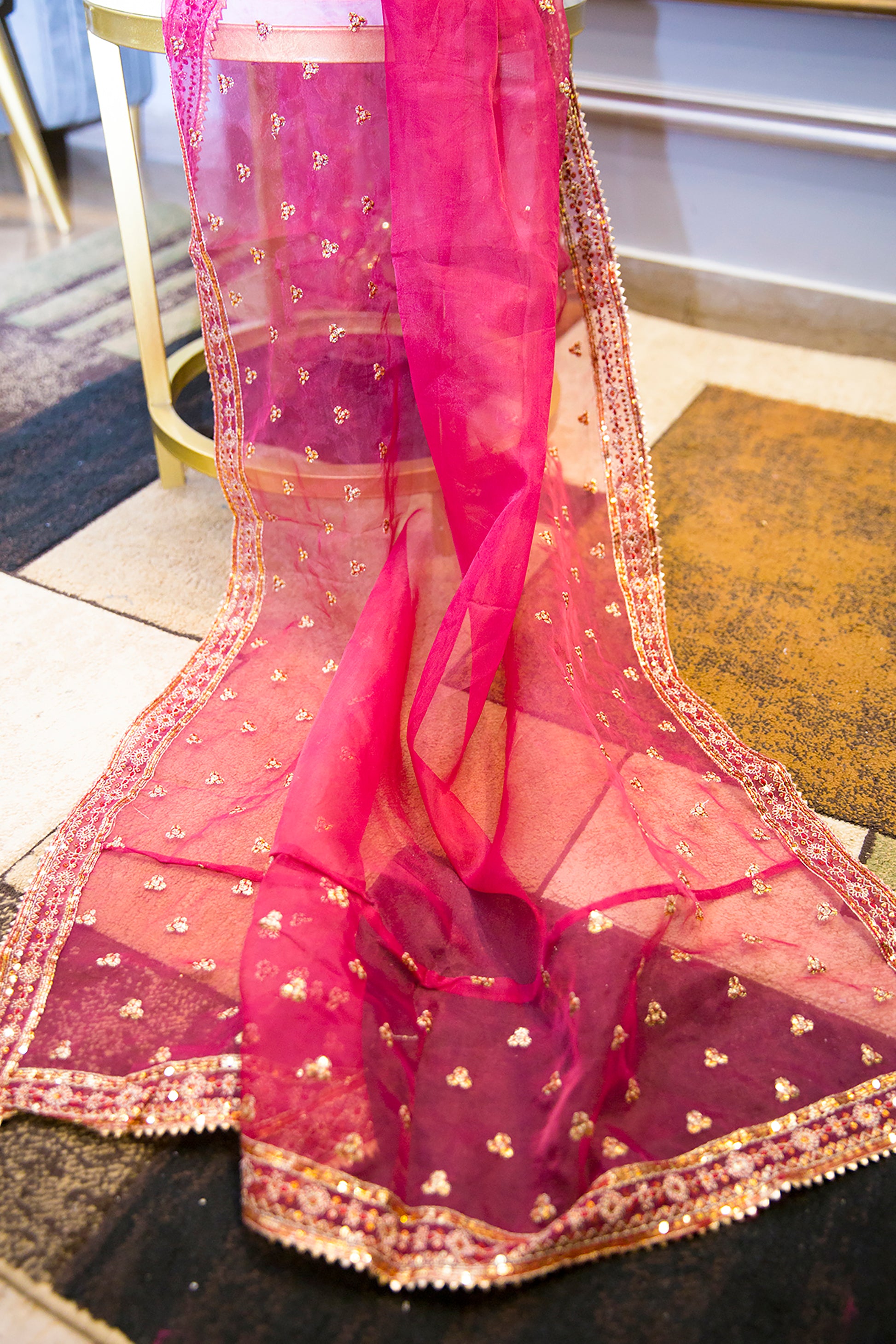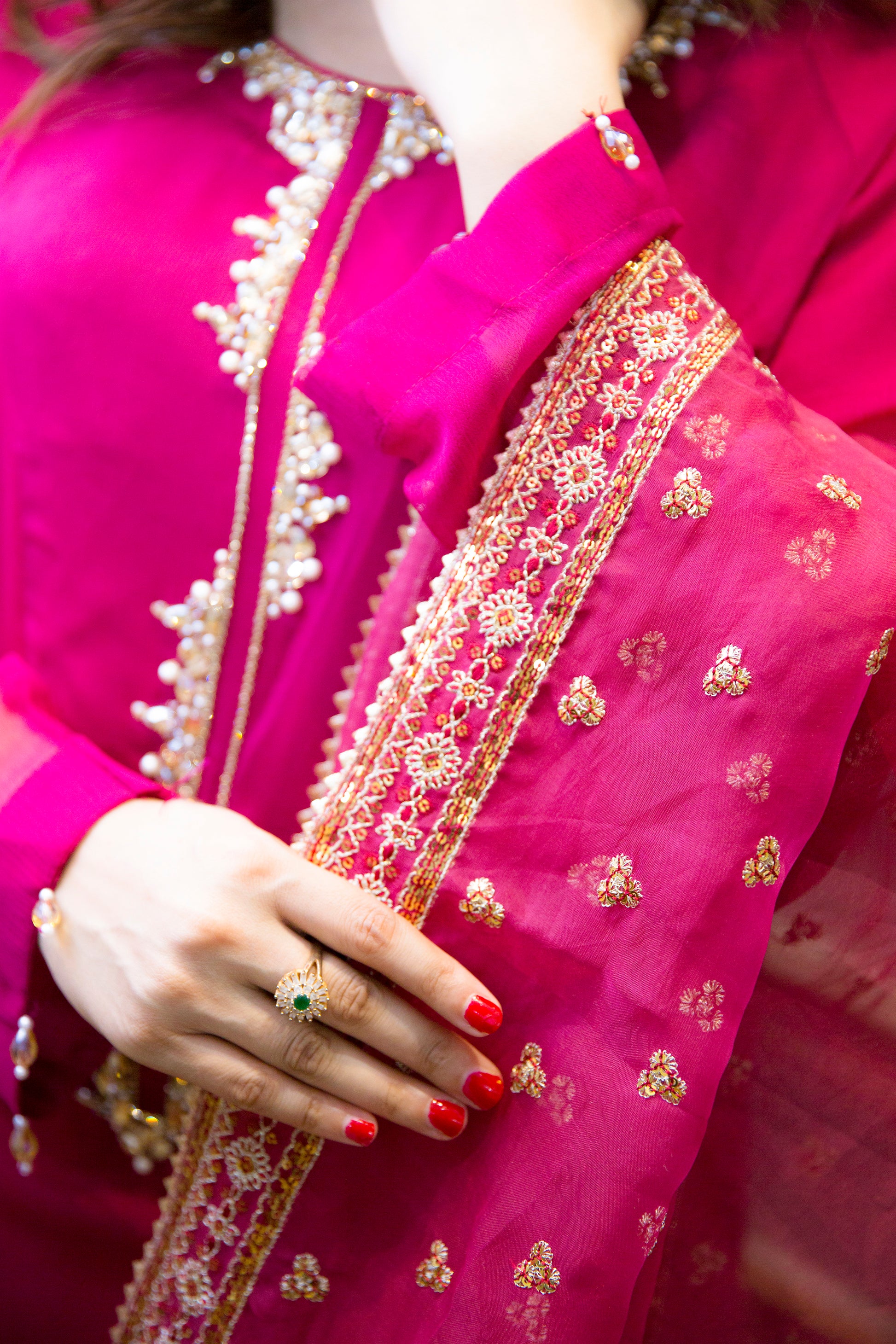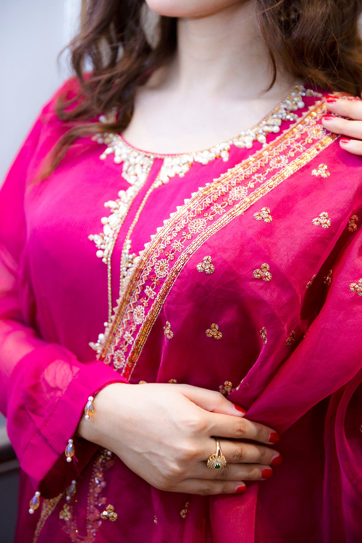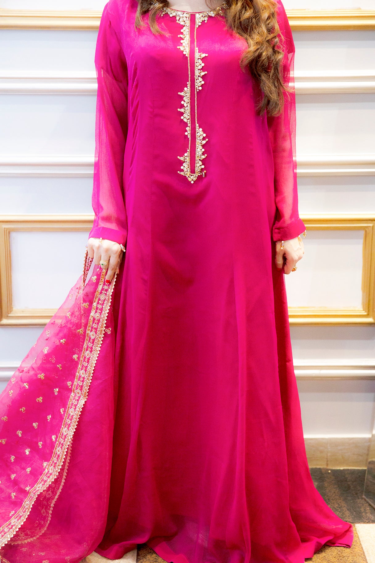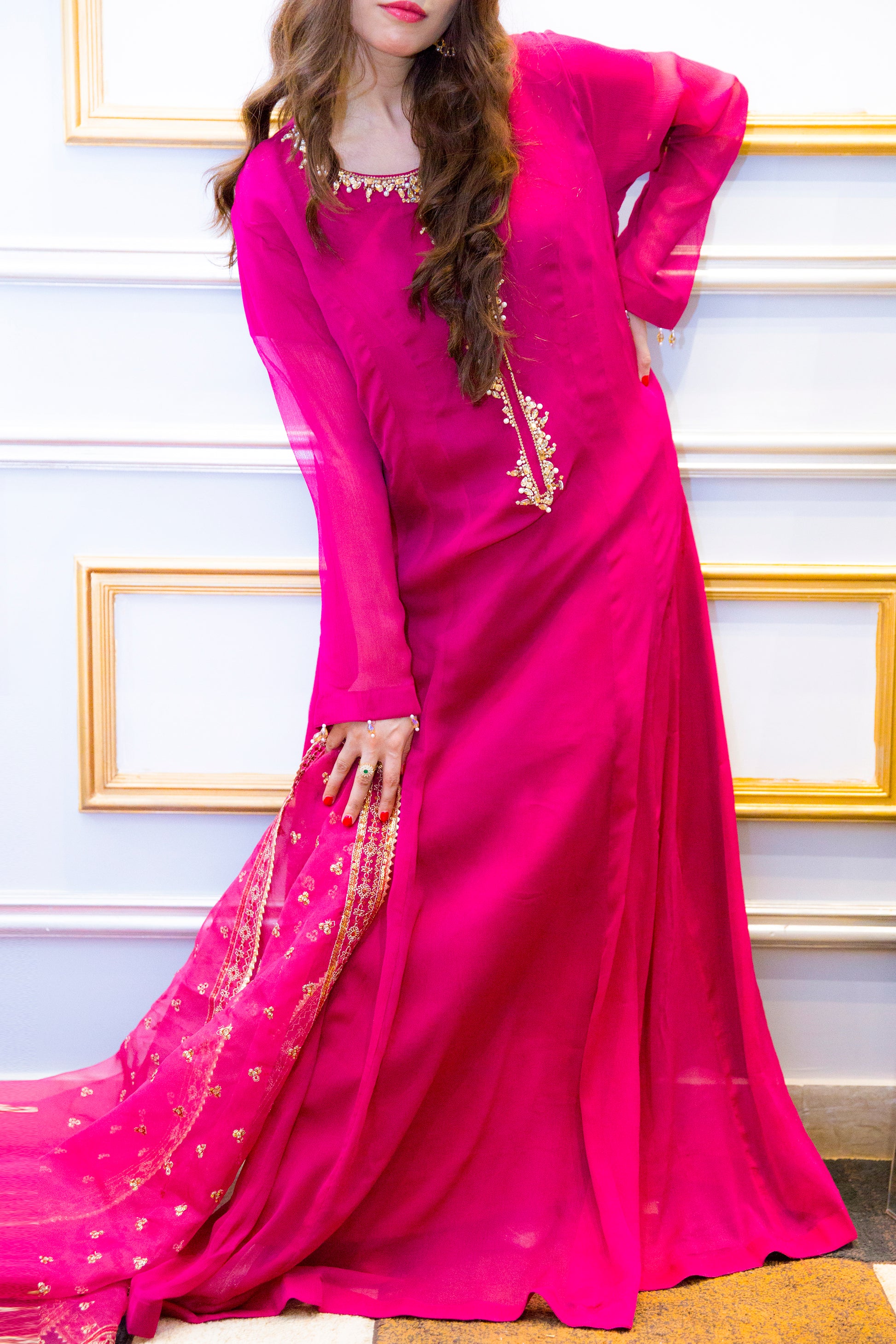 Type: This traditional outfit showcases a striking vibrant fuchsia or magenta-pink color,highlighted by its elegantly long and flowing dress dess.