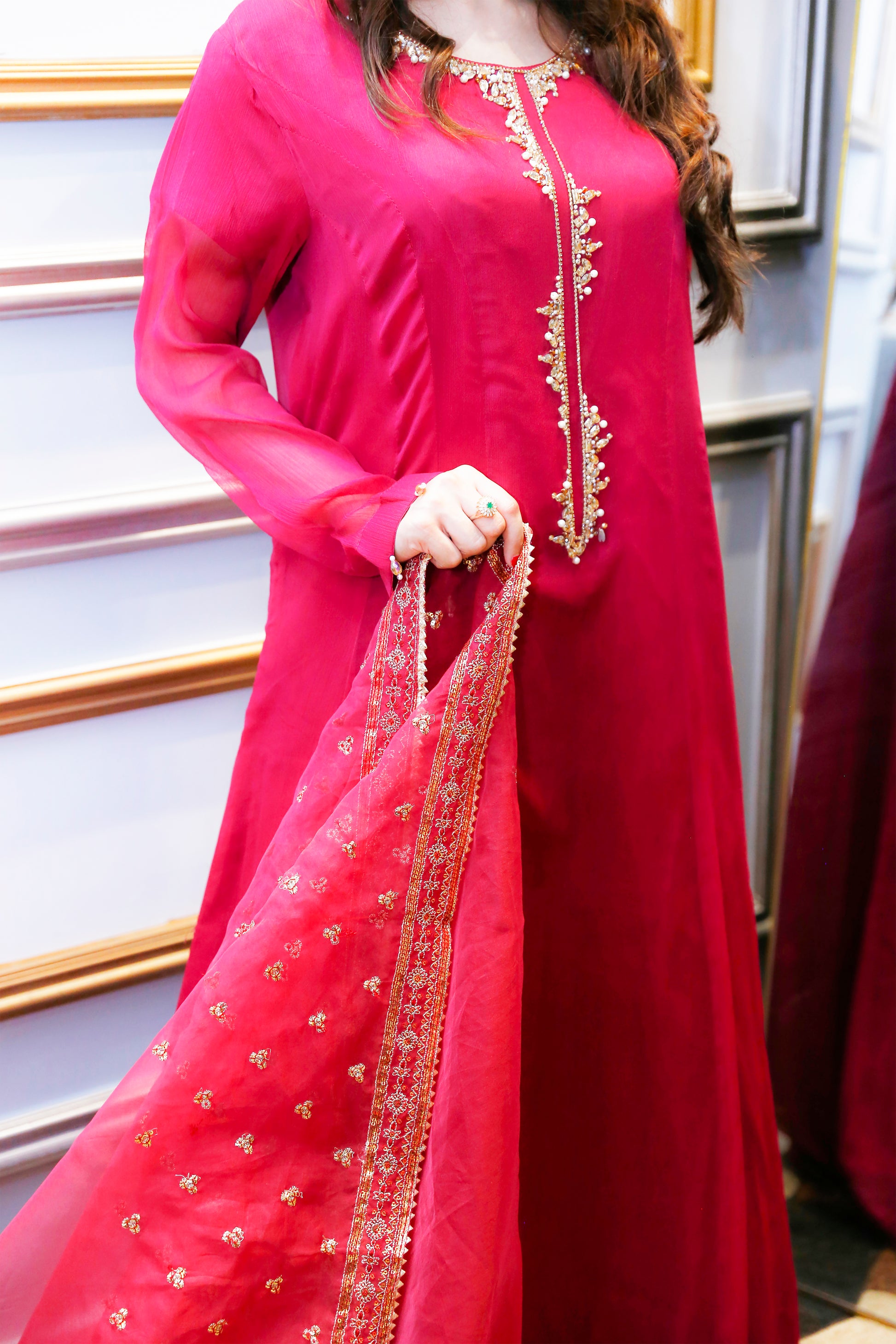 Fabric: The Rose Glow ensemble features a flowing chiffon frock crafted from Kathan silk, paired with a comfortable pajama and complemented by a delicate tissue dupatta, creating an elegant and graceful traditional outfit.